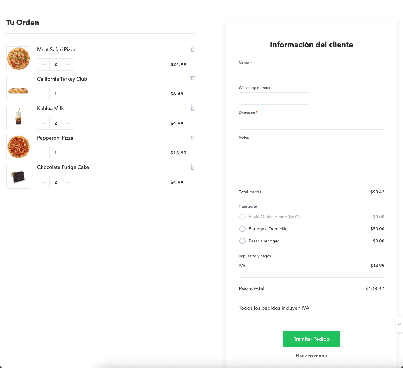 Página de Pedidos Dedicada: Desarrollamos una página web personalizada y fácil de usar, donde los clientes pueden navegar tu menú y realizar pedidos de manera eficiente.