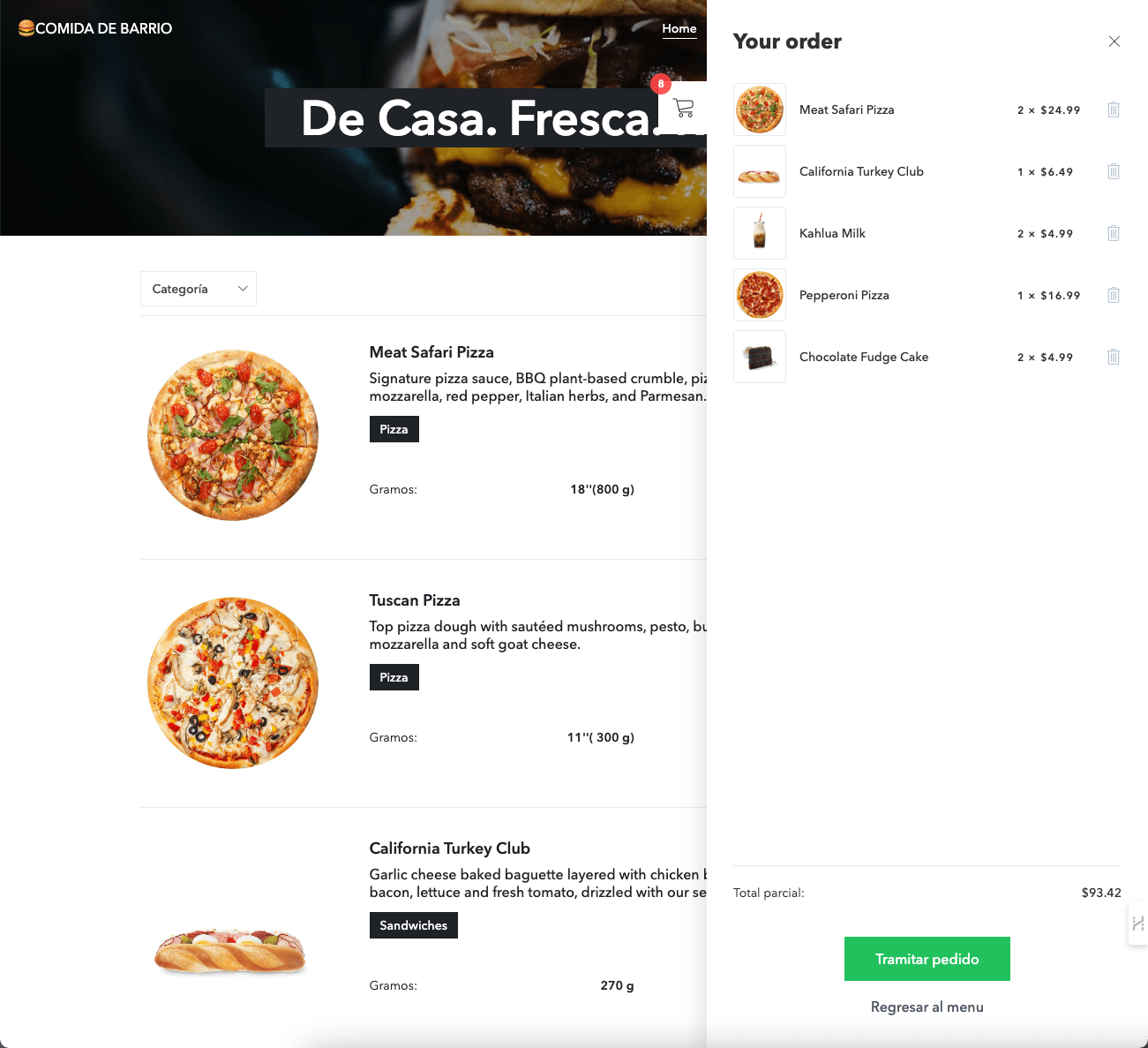Página de Pedidos Dedicada: Creamos una página web intuitiva y atractiva para tus pedidos, adaptada a la imagen de tu marca, donde los clientes pueden ver tu menú y realizar pedidos fácilmente.